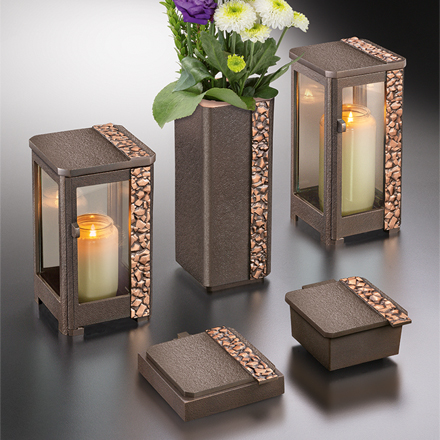 Zur Auswahl stehen: Grablaternen, Vasen, Blumenschalen, Weihwasserkessel, Grabkreuze, aber auch Ersatzgläser und Weihwasserpinsel, und vieles mehr. So können die Gläser graviert sein oder das Lampengehäuse, das aus Alu, Edelstahl oder Bronze besteht. Natürlich gibt es für die Grableuchter auch Ersatzgläser. Grabfiguren und in verschiedenen Stilarten aufwändig gefertigte Grabkreuze zählen ebenso zum beliebten Schmuck wie schöne Weihwasserschalen und -pinsel oder Pflanzengefäße und Steinauflagen. Mit solchem Grabschmuck wird Ihr liebevolles Gedenken sichtbar unterstrichen.